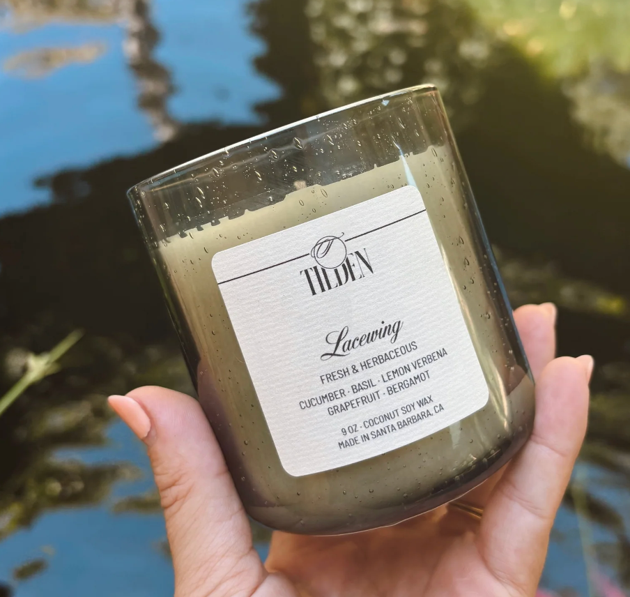 - Our hand-poured candle, made with cucumber, basil, bergamot, grapefruit, and lemon verbena. This fresh, herbaceous scent was carefully designed to complement a Lacewing cocktail. We crafted this candle in collaboration with Golden Arrow Goods, a small business in Santa Barbara.